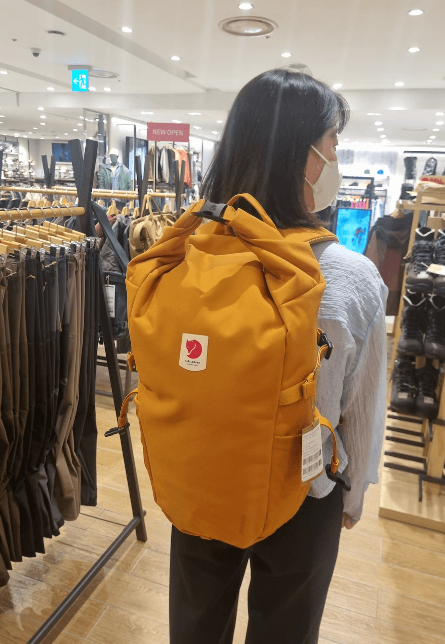 기본 피엘라벤 가방과 카이팩 28, 캠핑 등산용 가방 30리터(귤색) 이3가지를 직접 착용해 보았는데 가장 편안한것은 카이팩 등산 배낭이고 그다음 캠핑 등산용 가방, 기본 가방 등이였습니다.