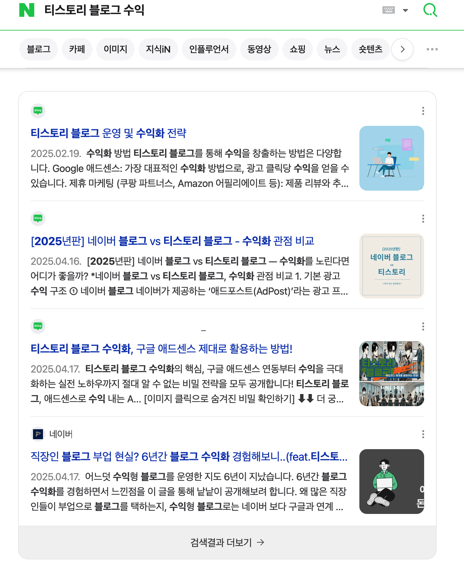 티스토리 수익이라고 네이버에서 키워드로 치면 이전에는 티스토리 블로그가 최상단에 있었지만, 이제는 네이버 블로그가 상단을 모두 차지하고 그아래는 브런치글이 뒤를 받치고 있습니다.