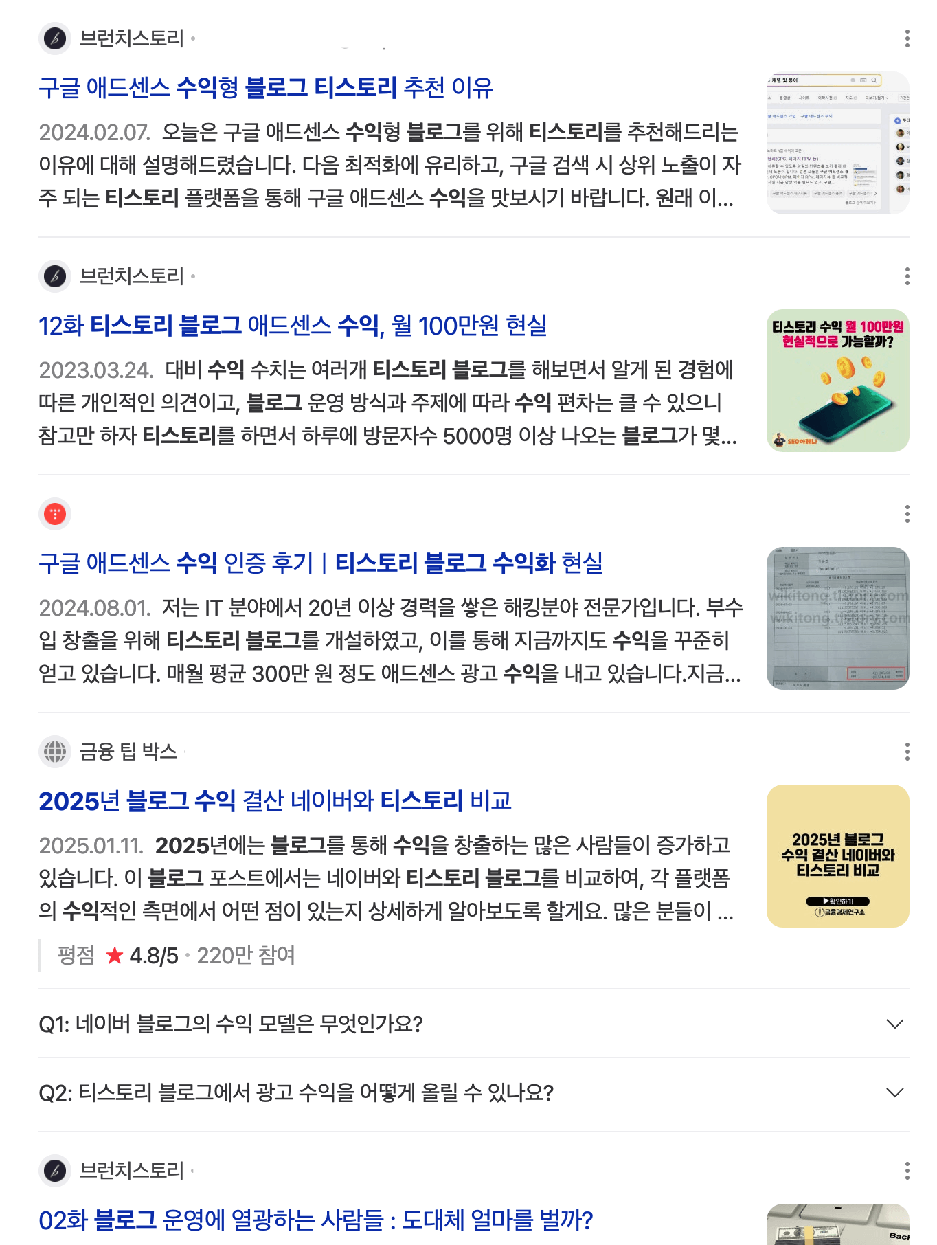 티스토리 수익이라고 네이버에서 키워드로 치면 이전에는 티스토리 블로그가 최상단에 있었지만, 이제는 네이버 블로그가 상단을 모두 차지하고 그아래는 브런치글이 뒤를 받치고 있습니다.