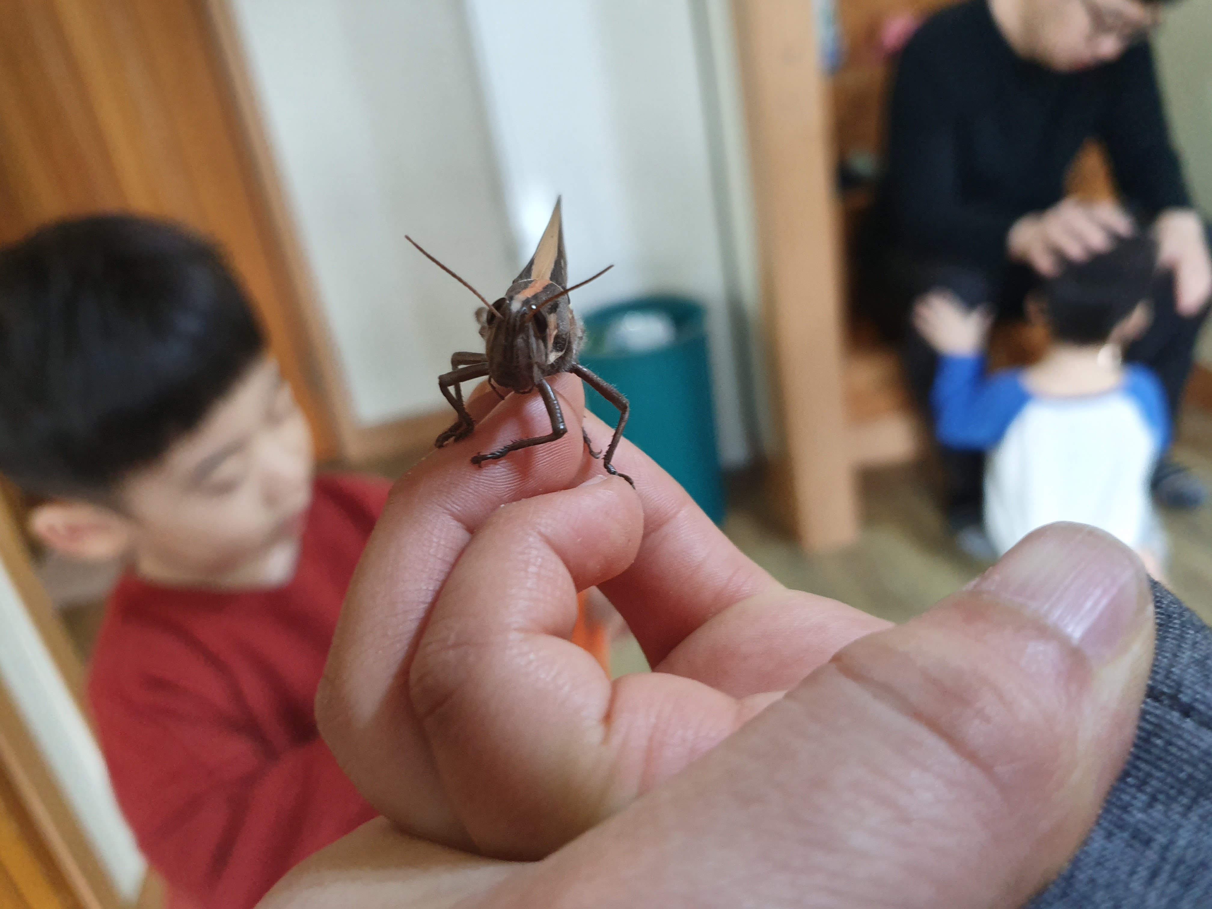 메뚜기와 사진을 찍고 각시메뚜기는 아이들의 동의하에 다시 자연의품으로 완벽하게 돌아갔습니다. 이상으로 겨울철에 메뚜기가 있다 없다 포스팅을 마치겠습니다.
