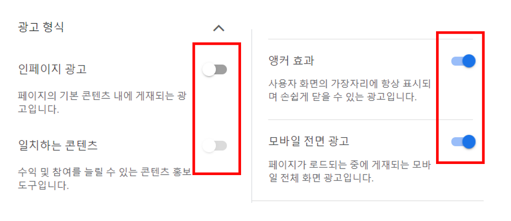 인페이지 광고 및 일치하는 콘텐츠를 저는 아래처럼 꺼놓습니다. 꺼놓고 앵커 광고 및 전면광고만 사용합니다. 의외로 앵커 효과가 좋습니다. 앵커 광고가 뭐냐면 휴대폰 맨 위 또는 아래에서 따라다니는 광고 있죠 그거입니다.