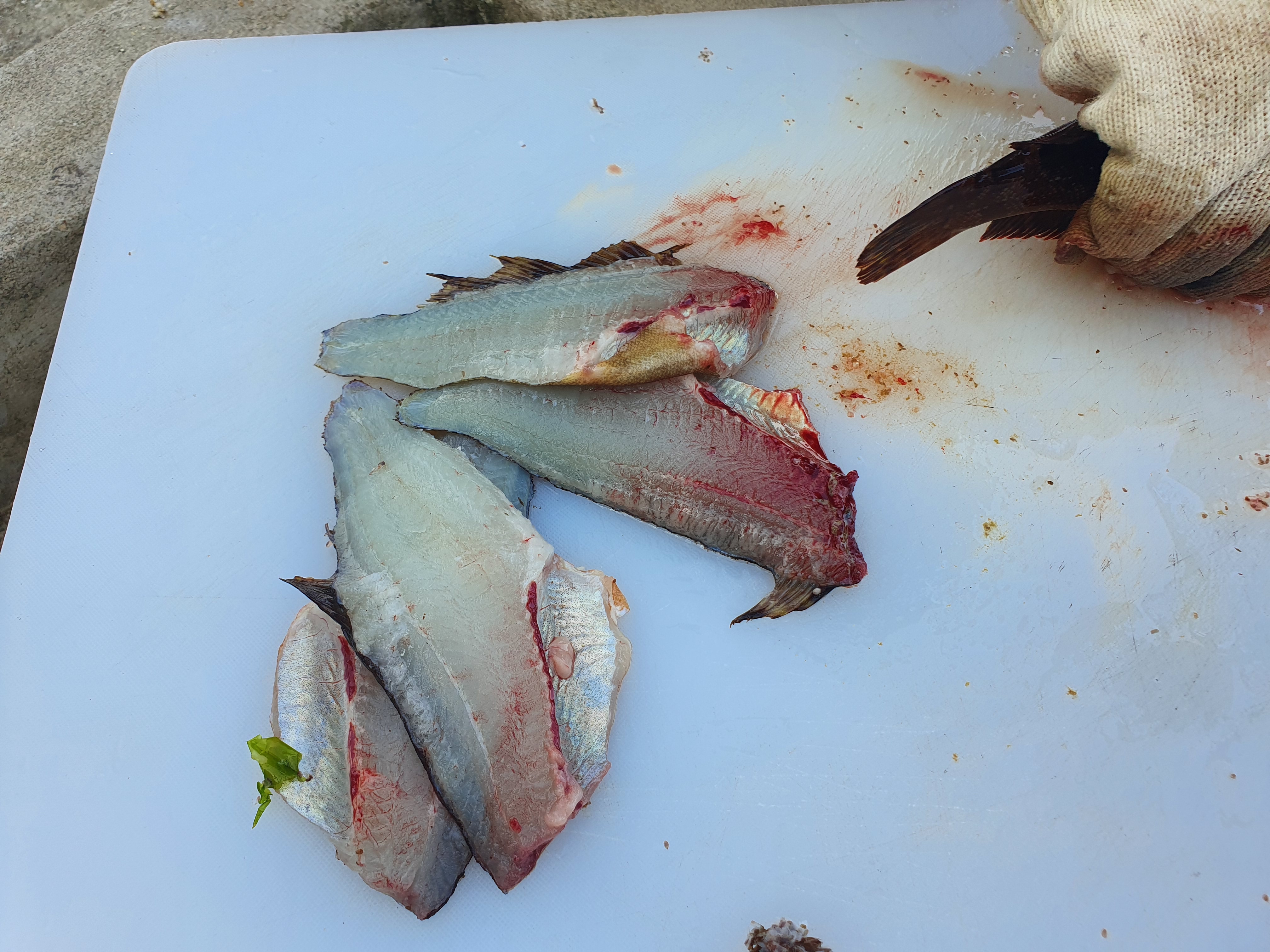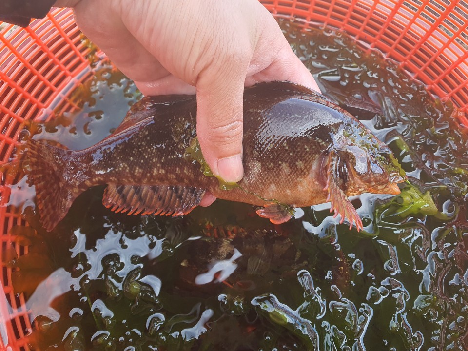 놀래기 씨알 엄청나죠 저도 저렇게 큰 놀래기 첨 잡았습니다. 뭘로 잡았냐고요. 아까 이야기했잖아요 반도로 잡았다고요. 반도로 잡다 보니 놀래기가 안 죽고 저렇게 회 시장에서나 볼 수 있는 상태로 소쿠리에 넣고 10분마다 물을 새로 받아주고 그렇게 살려서 회로 먹었습니다.