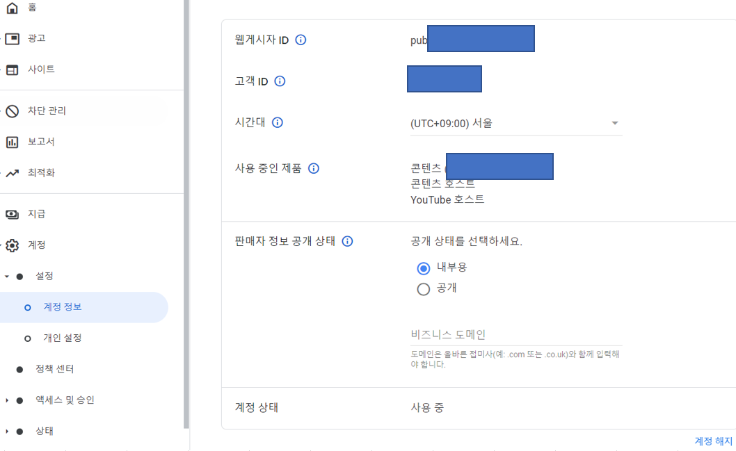 그게 아니라면 계정 정보로 들어가시면 위처럼 판매자 정보공개 상태란을 볼 수 있는 곳이 있습니다. 거기서 내부용, 공개를 선택하시면 됩니다.