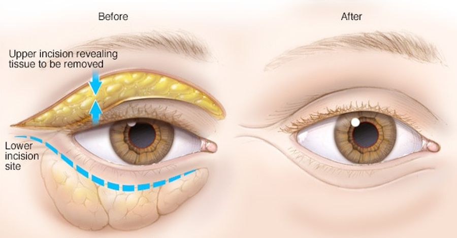 피부가 노화됨에 따라 점차 탄력을 잃습니다. 탄력이 부족하고 중력에 의한 지속적인 당기는 피부가 위와 아래 눈꺼풀에 모이게 합니다. 아래 눈꺼풀의 과도한 피부는 주름과 팽창을 유발합니다. 윗 눈꺼풀에는 여분의 피부가 속눈썹에 걸려 눈에 방해가 될 수 있습니다.
