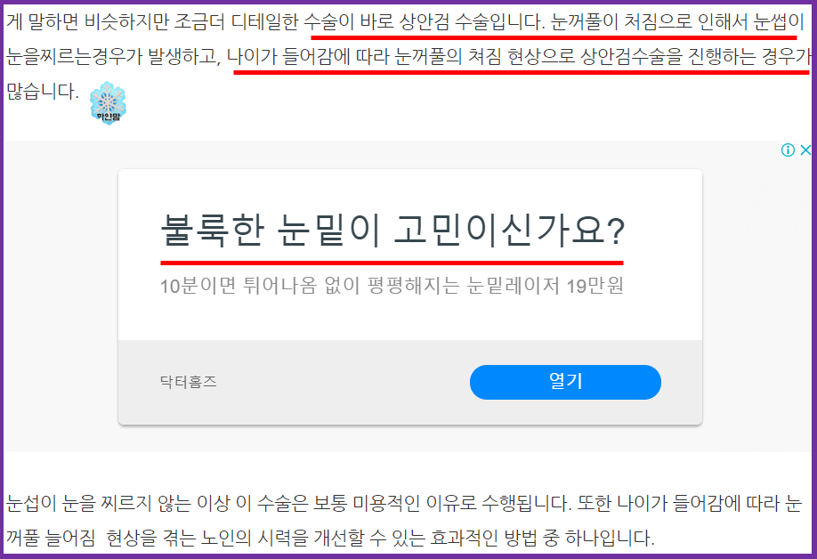최근 저의 블로그의 수익이 미미해져 가서 보충제로 먹인 것이 바로 눈에 대한 건강정보를 제공하며, 피부성형 또는 성형수술에 관한 비싼 광고를 좀 띄우자 생각해서 문맥에 이러한 광고를 생각해서 적은 것입니다. 저는 무조건 이렇게는 하지 않아요. 가끔 수익이 떨어지면 유지하기 위해 문맥광고를 한 번씩 신경 씁니다.