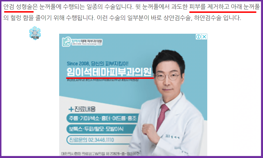 위 사진을 보면 빨간 줄 보세요. 안검 수술이라고 해도 되는 부분을 일부러 저는 비싼 키워드 성형이란 말을 썼습니다. 수술보다 한 템포 단가 높은 키워드, 그에 걸맞은 무엇가를 또 빨간 줄 보면 피부를 넣었죠. 그러면 위처럼 피부성형에 관한 병원이나 광고가 나올 확률이 커집니다. 그래서 아래를 알아야 합니다.