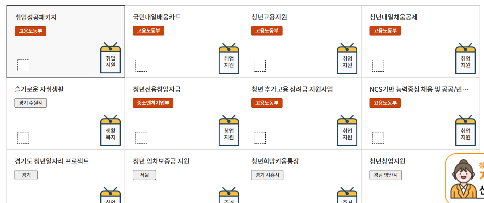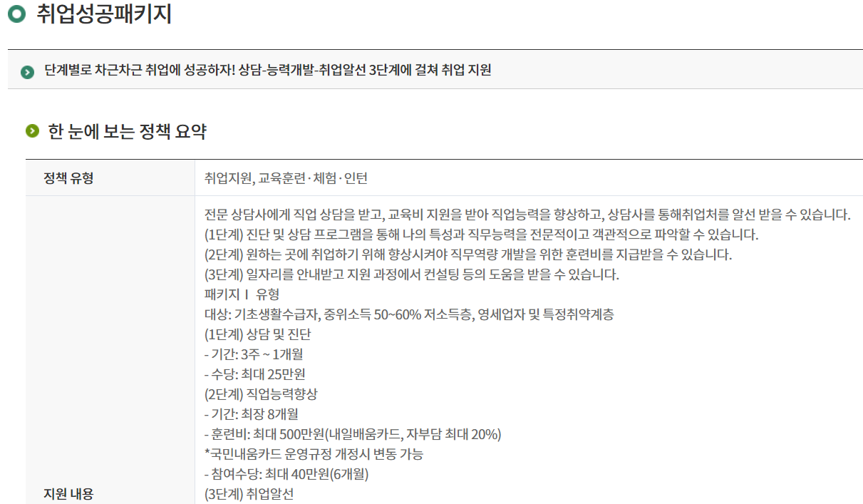 청년정책에서 청년정책 통합검색을 누르면 아래와 같은 여러 가지 내용들이 나옵니다. 취업성공 패키지 고용노동부와 관련된 취업지원을 눌러보면 자격부터 신청방법까지 자세하게 나옵니다.