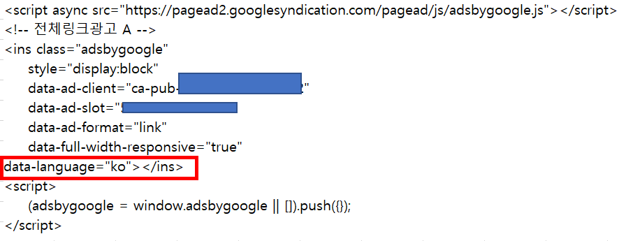 HTML에 해당 문구 (data-language="ko")를 넣는 이유는 아시다시피 애드센스 광고는 우리나라 언어로 된 광고만 있는게 아니라 여러나라 언어로된 광고들이 많습니다. 우리나라 말로 나오는 광고가 나와도 클릭할까 말 가인데, 이런 외국 광고가 상단에 팍 나오면 수익이 좋지 않겠죠.