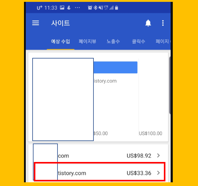 일단 제 부계정 중 하나에 있는 최적화 블로그를 사용하다 보니 본의 안이게 부계정 수익이 나와 버렸네요, 해당 계정은 하얀 맘 계정과는 별개입니다. 현재 오전 11:33분 33.36달러를 기록하고 있네요. 방문자 수도 더 작은데 클릭은 해당 실험용 잇슈 블로그가 지수도 약한데 SNS를 활용해서 수익이 더 나왔습니다.