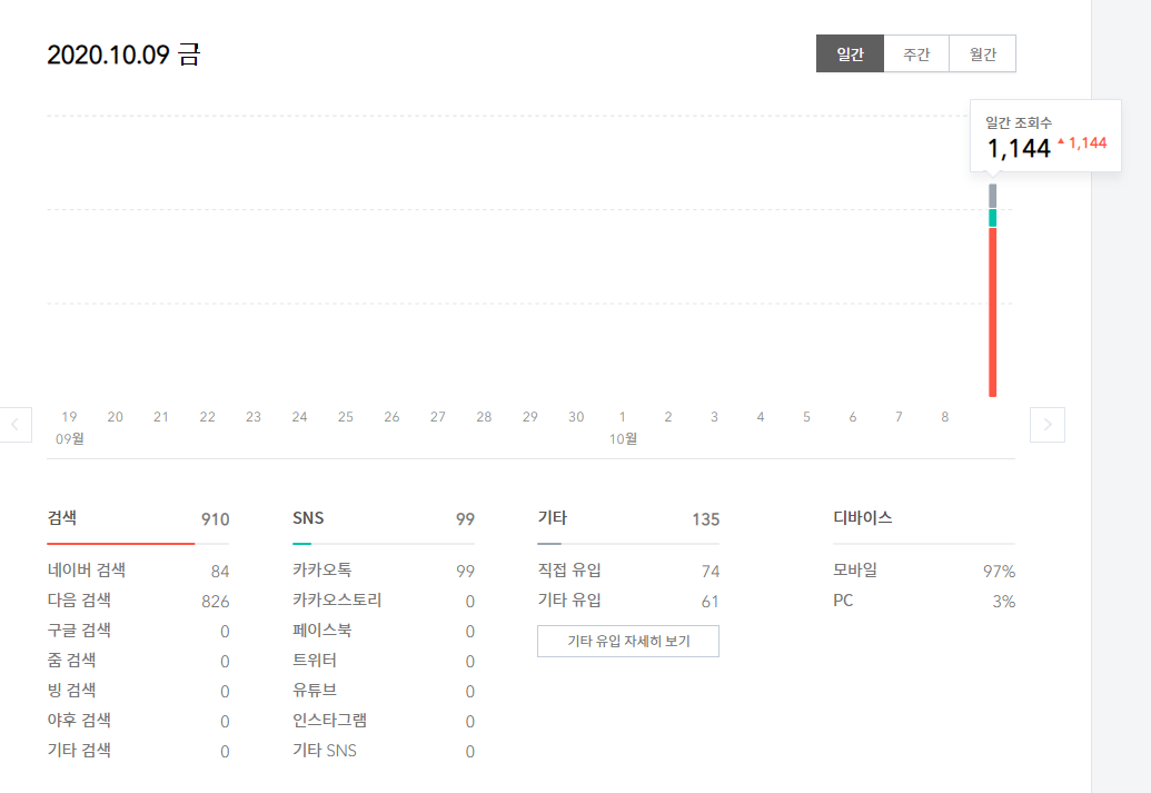 음 해당 블로그는 글이 몇 개 안 되는 그저 최적화만 된 블로그라 역시나 긴급을 요하는 주제로 글을 썼지만, 이건무 효과가 별로 없네요. 방문자가 없으니 아무리 주제가 좋아도 유입이 없으면 말짱 도루묵입니다.