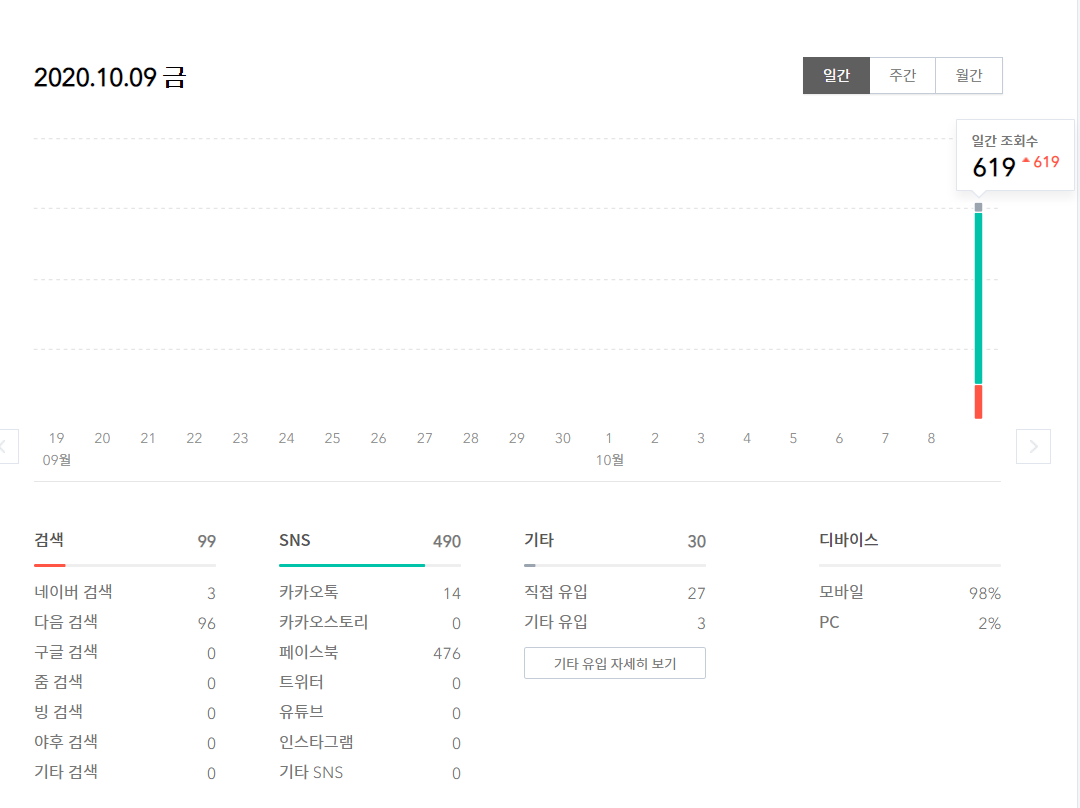 그럼 유입을 만들면 되겠죠. 트위터나 페이스북 인스타그램 등 아무거나 골라서 하나만 했습니다. 3곳에서다 유입시키면 방문자가 너무 많아지고, 제품 먹을까 봐 해당 블로그로 소소하게 페이스북에만 뿌려보았습니다.