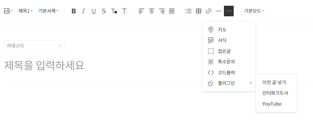 자 보이시죠 우리가 기본적으로 쓰는 티스토리 튤입니다. 저기 보면 이전에 없던 인터파크도서가 생겼습니다. 맞아요 좀 전에 우리가 플러그인에 추가했잖아요 그렇죠, 그래서 생긴 겁니다. 혹 이걸 몰랐던 거 아니에요. 하하하 간단한 보충설명