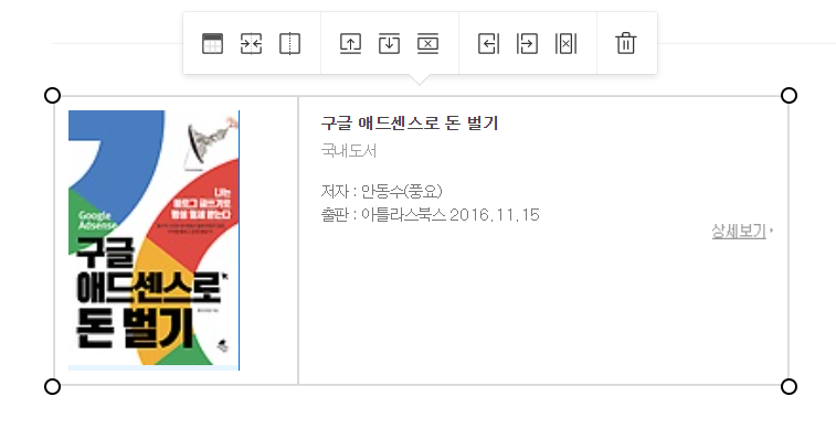 우리가 작성하는 티스토리 튤에 저런 게 나오네요 크기 조절 위에 보시면 화살표 칸 채워 넣고 만들기 등등 제거하고 추가하고 가능하게 되어 있으며, 크기는 마우스로 상자 조정하듯 작고 크게 비율이 가능합니다. 아주 손쉽게 예쁘게 만들 수 있으니 책 리뷰 관련이거나 이 책 추천하고 싶다고 하시는 분들 한번 사용해보세요.