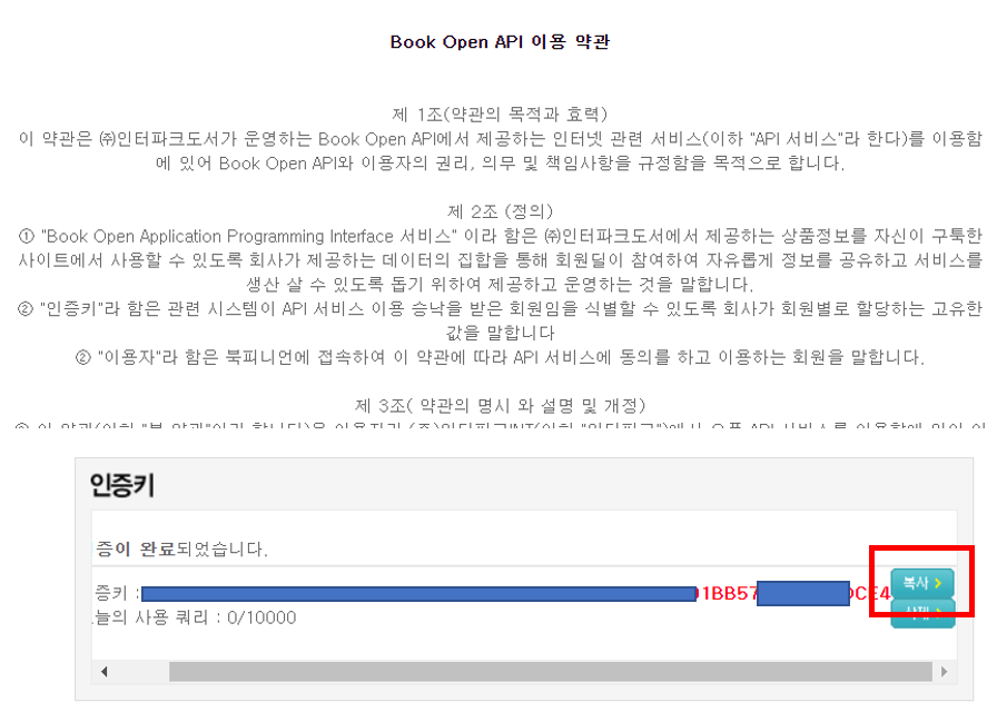 이렇게 두가지 사이트가 모두 로그인되어 있다면, 아래 인증키 발급받기를 누릅니다. 그러면 자동으로 인증키가 나와요 그것을 복사를 해서 인증키 입력란에 붙여 넣기 하시고 적용을 하시면 됩니다.