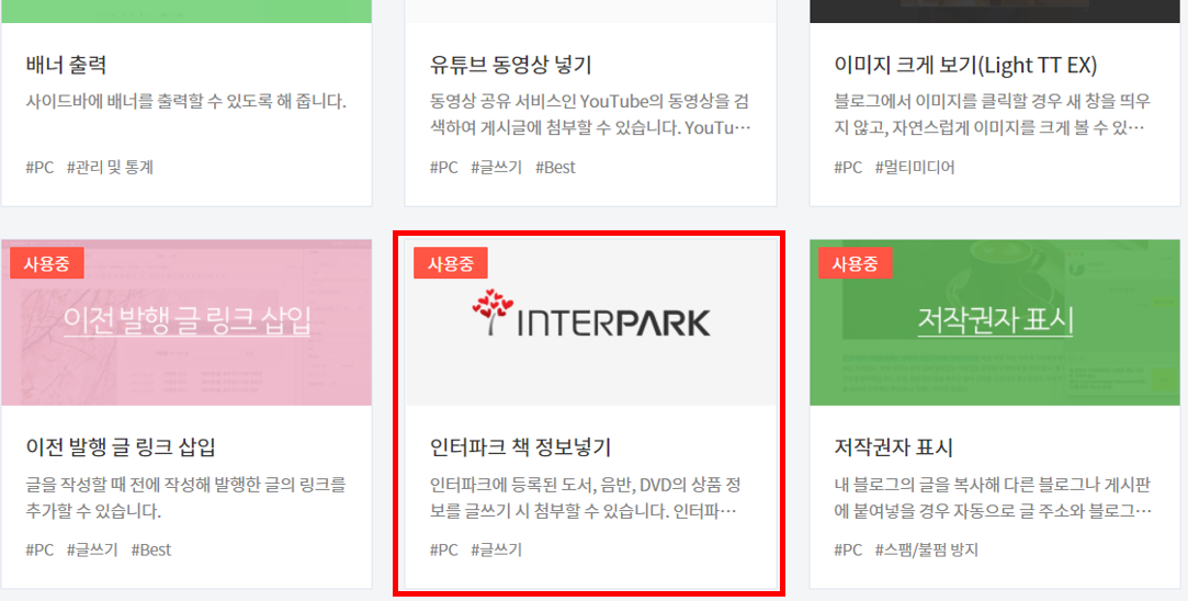 제 블로그의 플러그인에 보시다시피 이전 글 넣기, 인터파크도서, 유튜브가 설정되어 있습니다. 즉 자신이 설정한 플러그인이 저기 나오는 것이죠, 이제 이해가 되시죠 그럼 다시 본론으로 갈게요. 인터파크도서를 눌러봅니다.
