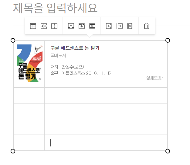 우리가 작성하는 티스토리 튤에 저런 게 나오네요 크기 조절 위에 보시면 화살표 칸 채워 넣고 만들기 등등 제거하고 추가하고 가능하게 되어 있으며, 크기는 마우스로 상자 조정하듯 작고 크게 비율이 가능합니다. 아주 손쉽게 예쁘게 만들 수 있으니 책 리뷰 관련이거나 이 책 추천하고 싶다고 하시는 분들 한번 사용해보세요.