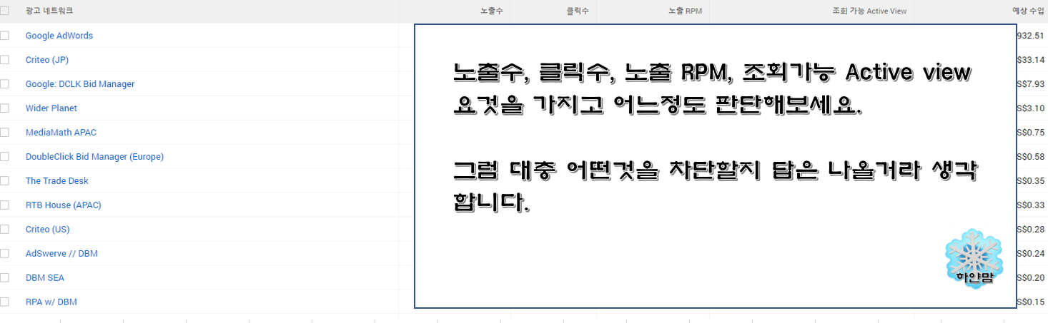 자 나머지 광고들 특히 criteo(JP) 노출수 클릭수에 비해 수익이 엉망일 거예요. 그런데 저는 왜 나 두었냐고 요. 그러게요 차단한 줄 알았는데 애가 떡하니 살아있네요. 아무튼 위와 같은 자료가 있으니 스스로 아니다 싶은 건 차단해보고 실험해보세요.