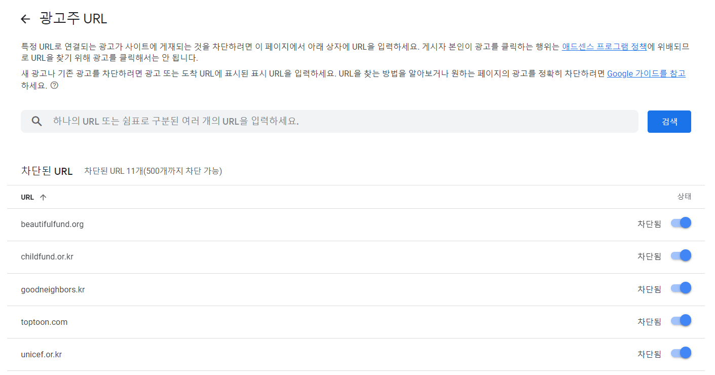 간단한 설명으로 광고주 URL은 맘에 안 드는 광고주의 URL을 차단할수 있습니다. 아 나는 재가 단가도 싸고 맘에 안드는 업체인데 꼭 내 블로그에 광고가 유입되네, 그러면 차단하셔야죠.