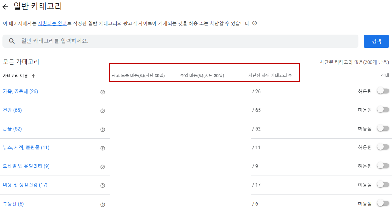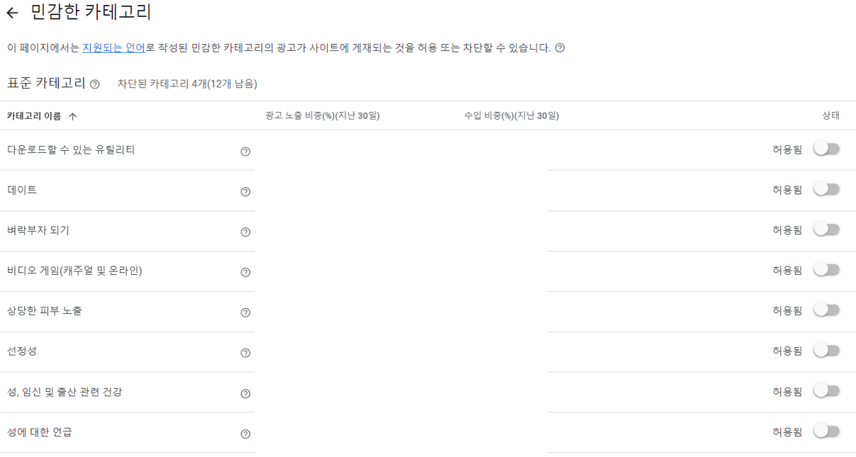 말 그대로 민감합니다. 애가 호불호가 갈려요. 아직도 이해할 수 없는데 어떤 블로그는 성에 대한 언급을 차단하면 수익이 오르는가 하면 어떤 블로그는 차단하면 수익이 줄어들더라고요. 위에 보면 광고 노출 비중과 수입비중을 보면서 스스로 판단해서 한 번에 끝내지 말고 여러 번 차단할 거 해보고 실험해 보세요. 이것만 하는데도 전 몇 달 걸렸거든요.