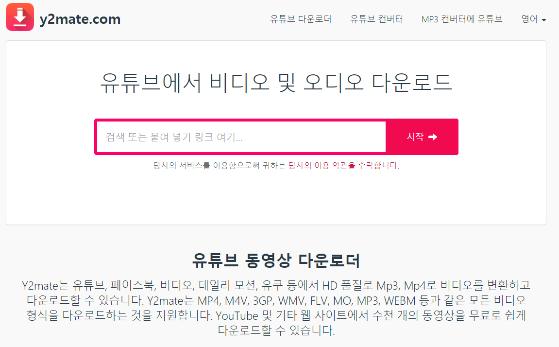 위와 같이 URL 주소를 가져오는 방법이 2가지가 있습니다. 편하신 대로 사용하세요. 자 어떤 사이트에 가서 해야할가요. 링크 달려다가 그냥 주소만 가르쳐 드릴게요. ( y2mate.com ) 이주소 입니다. 제가 여길 추천하는 이유는 가입같은게 필요없고 바로 유튜브 영상주소 붙여넣기 하면 되기 때문에 간편해서 추천드립니다.