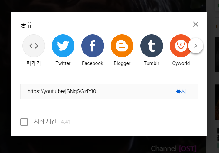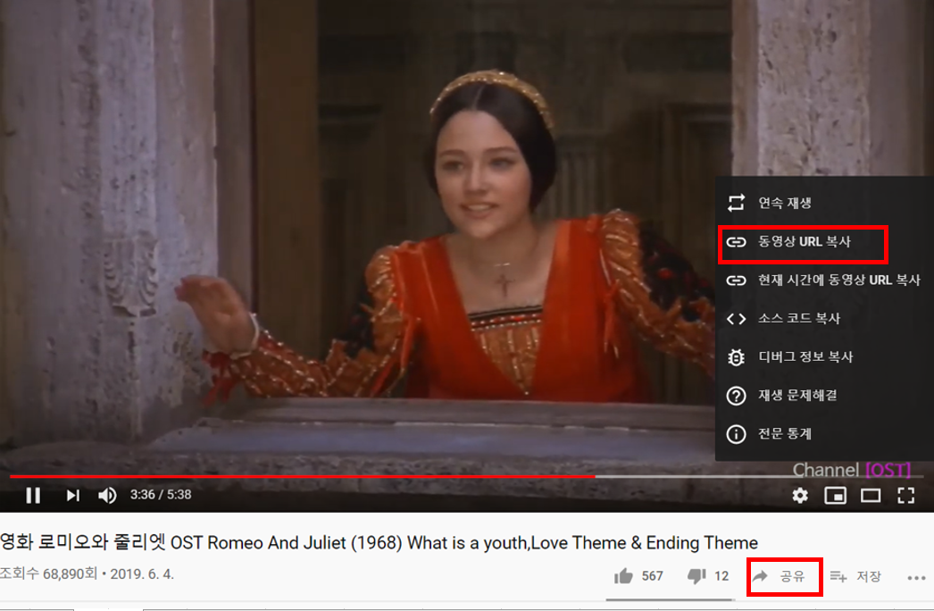 해당 동영상에서 마우스 오른쪽 클릭을 하면 위 화면과 같이 동영상 URL복사가 나옵니다. 그것을 누르면 복사가 됩니다. 또 다른 방법으로는 공유를 클릭하면 주소가 나옵니다 그것을 복사해서 변환 사이트에 넣으면 됩니다.