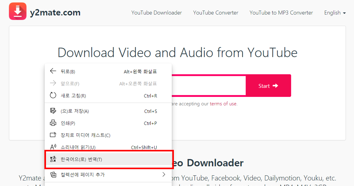 자 그러면 아래와 같이 한글로 번역되어서 나옵니다. 참 쉽죠. 저기 검색 또는 붙여넣기 링크여기 저부분에 앞서 유튜브에서 복사한 주소를 붙여넣습니다.