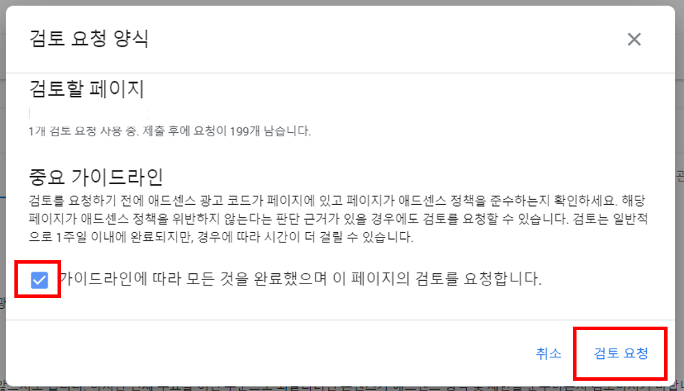다시 애드센스 정책센터로 가서 해결방법 -> 검토 요청을 누르시면 됩니다. 그러면 검토요청 양식이 나오는데요 여기서 캄보 박스 클릭해주고, 검토 요청하면 됩니다.