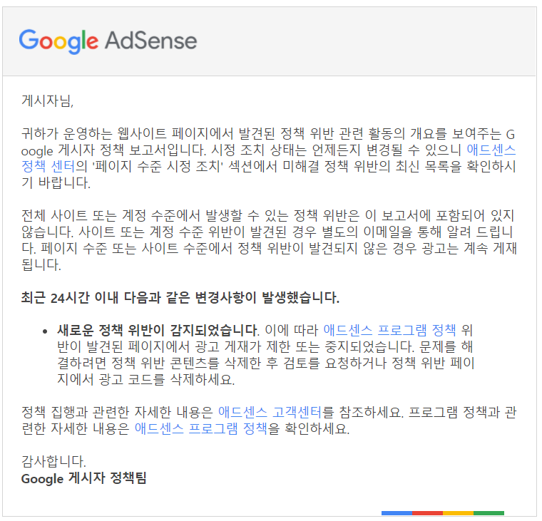 어느 날 갑자기 위와 같은 메일이 날아옵니다. 처음에 놀라지 마세요. 광고 중단 메일이라 착각하지 마시고요. 잘 읽어보면 정책 위반이 발생했고 페이지 수준 또는 사이트 수준의 정책 위반이 발견되지 않은 경우 광고는 계속 게재됩니다.