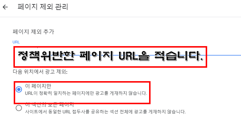 URL위치에 정책위 반한 페이지 URL 주소를 적어준 후 이 페이지 만을 선택하여 옆에 보면 추가가 있는데 사진에서 잘렸네요. 그 추가를 선택하여 누르면 아래와 같이 해당 페이지에 광고 게재가 되지 않습니다.