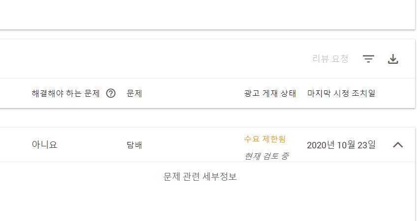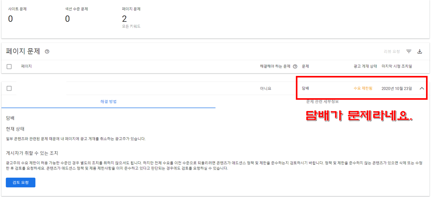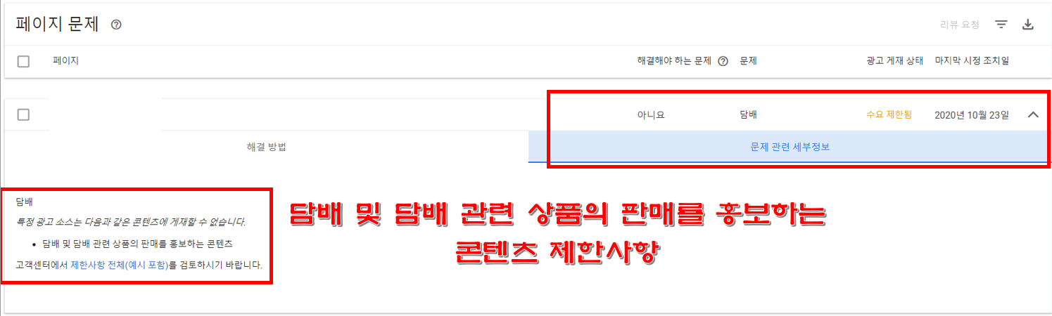 그러면 원인이 나옵니다. 10월 23일 저의 정책 위반은 예전에 써놓았던 담배 관련 글이 정책 위반이 되었네요. 이것은 누군가의 신고라기보다 구글이 지향하는 정책에 담배를 배제하는 것이오니 이런 위반 글은 고쳐주어야 합니다.