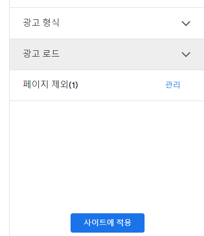 자신이 선택한 페이지 광고 제외를 확인한 후 나가서 사이트에 적용을 해주셔야지만 적용이 됩니다. 적용하지 않고 그냥 넘어가면 적용되지 않은 그대로이니 깜빡하지 마세요. 사이트 적용 꼭 하신 후, 이제 구글에게 너희들이 시키는 데로 내가 조치를 했으니 확인해 봐라 그런 이야기를 해주기 위해 나갑니다.