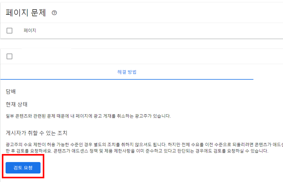 다시 애드센스 정책센터로 가서 해결방법 -> 검토 요청을 누르시면 됩니다. 그러면 검토요청 양식이 나오는데요 여기서 캄보 박스 클릭해주고, 검토 요청하면 됩니다.