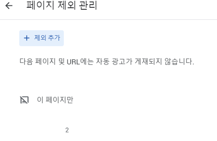 URL위치에 정책위 반한 페이지 URL 주소를 적어준 후 이 페이지 만을 선택하여 옆에 보면 추가가 있는데 사진에서 잘렸네요. 그 추가를 선택하여 누르면 아래와 같이 해당 페이지에 광고 게재가 되지 않습니다.