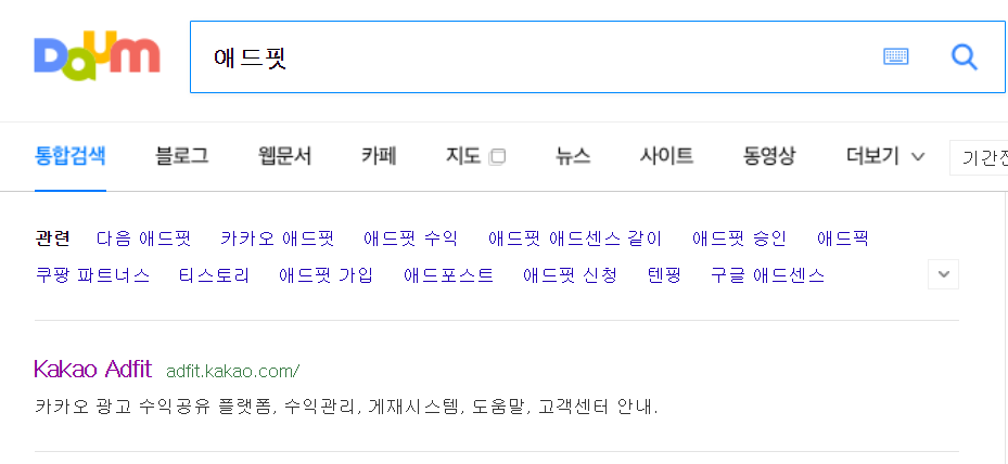 애드핏 가입방법은 생략이라고 하여도 들어가는 방법은 알아야죠. 네이버에서 애드핏 치면 예전 버전 나와서 많이 귀찮아요. 포털 다음에서 애드핏을 치면 아래와 같은 화면이 나옵니다.