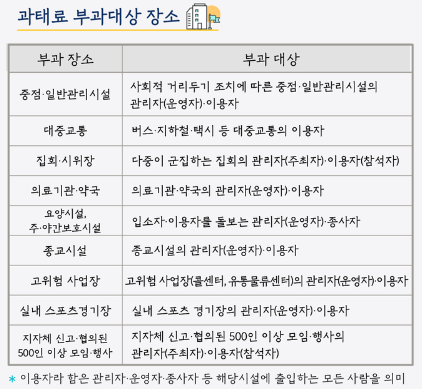 보건 복지부에서 가져오는 사진이 편한거 같아 가지고 와봤습니다. 부과장소를 잘봐두시구요. 부과대상에 자신이 들어가는지 안들어가는지 확인후 언제나 마스크를 착용해야 하지만, 특히나 부과장소에서 부과대상이 되는경우 누가 지적한다고 화내지 마세요.