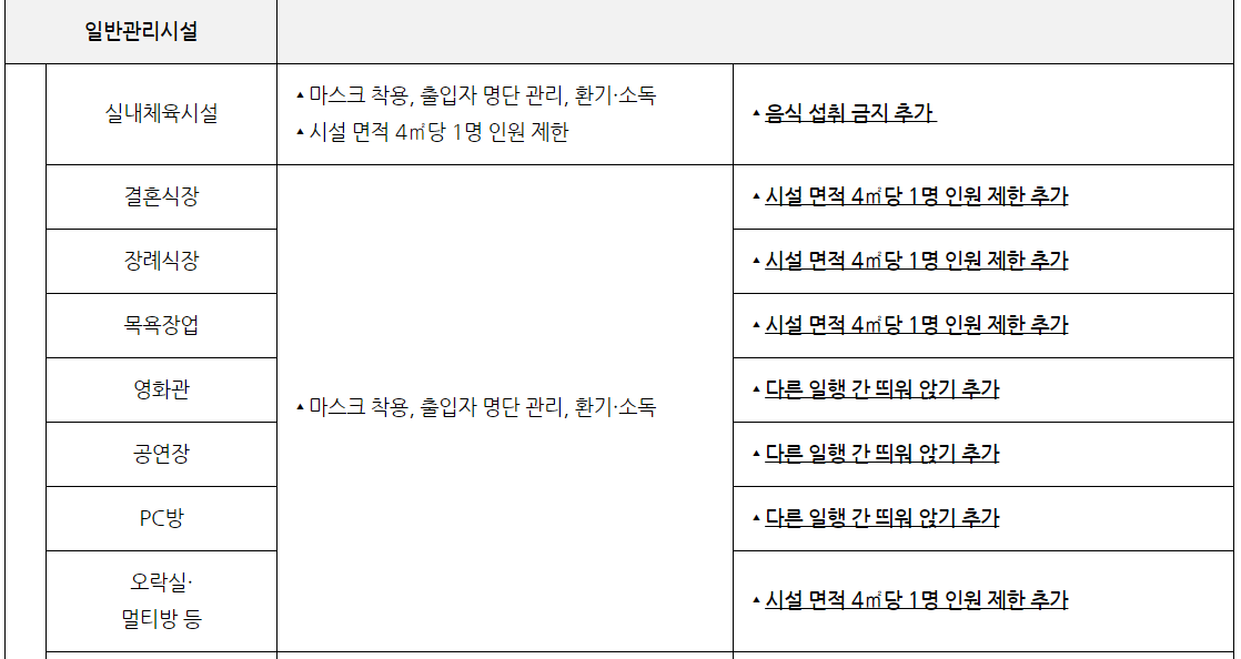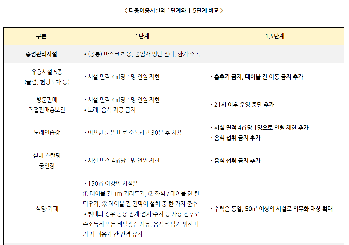 ▣ 코로나 1단계 1.5단계 시설이용 비교
