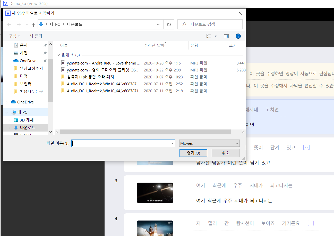 파일 -> 새영상파일로 시작하기를 누르면 여러분이 자동자막을 넣을려고 하는 그 파일을 아래처럼 클릭해서 가져오면 됩니다. 저장해놓은 영상이 로미오와줄리엣 음악파일뿐이라 그냥 애로 해볼게요. 자막만 들어가면 되니깐