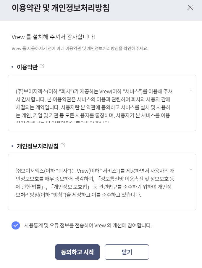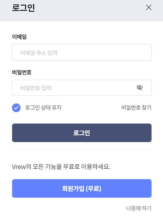 위처럼 사용통계 및 오류정보를 전송하여 vrew의 개선에 참여합니다. 콤보박스를 클릭하시고 동의하고 시작을 누르시면 옆에 로그인이 나옵니다. 그런데 귀찮게 로그인 할필요없어요. 그냥 나중에하기 누르시고 넘어가시면 됩니다. 그러면 아래와 같은 사진이 나옵니다.