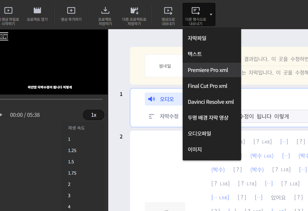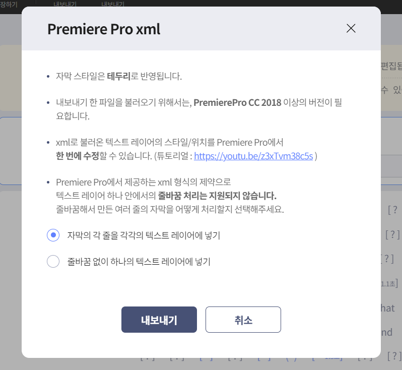 이차 저차 파일이 완료되었다면, 다른형식으로 내보내기 -> Premiere Pro xml 이것을 눌러줍니다. 그리고 아래 사진처럼 자막의 각줄을 각각의 텍스트레이어에 넣기를 선택후 내보내기를 하면 됩니다. 그런후 저장위치에 저장합니다.
