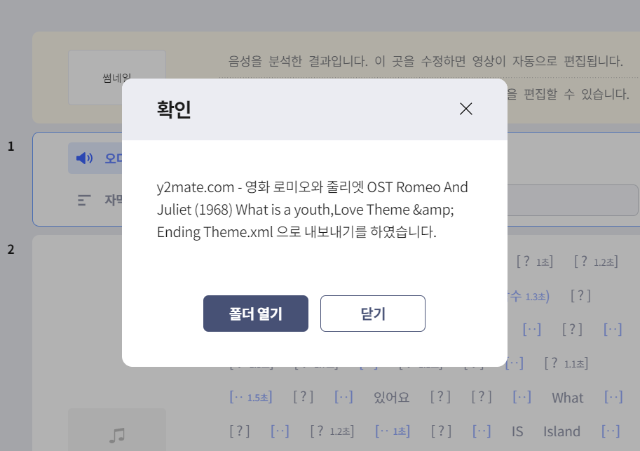 그런다음 다른형식으로 내보내기 옆에, 영상으로 내보내기 그것을 클릭하면 뭐가 없다고 하는데 확인 눌러주면 스스로 다운받고 실행됩니다. 그러면 아래와 같이 확인 버튼이 나오고 저장시킬 폴더열기를 누르고 실행시켜보면 내가 넣었던 자막이 그대로 나오네요.