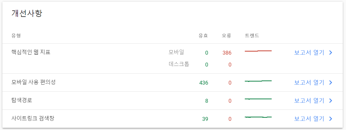 여기서 Google Search Console 바로가기를 클릭하면, 이전에 등록되어 있었다면 바로 구글서치콘솔로 넘어가게 됩니다. 거기서 개선사항을 보면 핵심적인 웹지표가 나오죠 보고서 열기를 해서 보면 무엇이 문제인지 나옵니다.