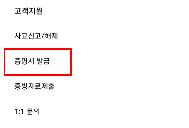 그런다음 고객센터 -> 증명서 -> 나의 증명서 발급내역을 클릭합니다.
