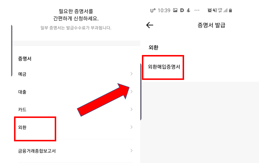 그러면 위와 같이 외환이 나오고 외환을 누르면 -> 외환매입증명서를 클릭해줍니다.