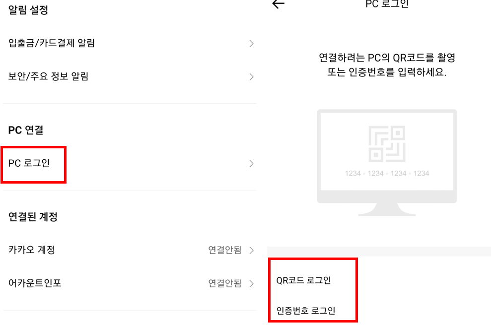 그러면 위와 같이 로그인 하기가 뜨는데요. 여기서 로그인 하는 방법이 또 있습니다. 기존에 사용했던 카카오뱅크 앱에 다시 들어가서 아래 앱설정 보이시죠. 그걸 누르시면 -> PC로그인 -> QR코드 로그인 누르시고 위의 코드를 가져다 대면 개인의 승인비밀번호를 입력하면 로그인이 됩니다.