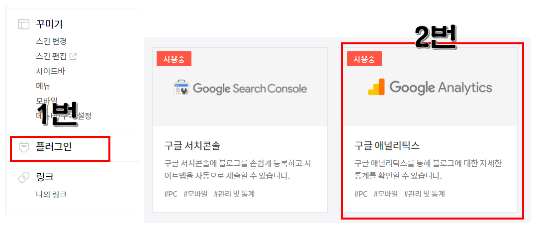 하얀 맘이 진심으로 알려드립니다. 주마등님 이대로 따라 하시면 됩니다. 아셨죠 번호 다 달아드릴게요. 할 수 있습니다. 아래 플러그인으로 들어가셔서 구글 애널리틱스를 누릅니다(1번 2번).