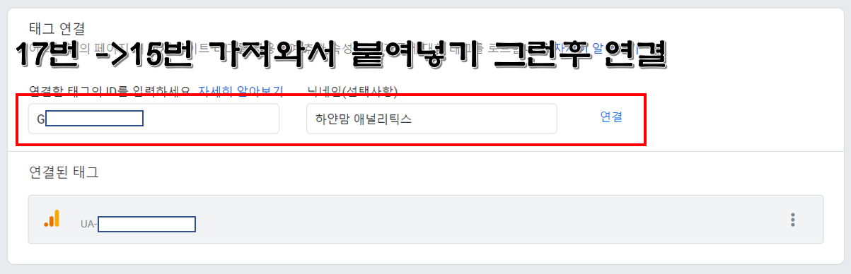 자그런 후 16번으로 옵니다. 애는 아까 14-1번 바로 아래에 보면 html소스 있는데 거기에 있구요. 연결된 사이트 태크 이걸 누릅니다. 그러면 아래 17번과 같이 나오는데 다시 15번 측정ID를 복사해서 붙여 넣습니다. 닉네임은 아무거나 적어도 됩니다. 그런후 연결 이제 거진 끝입니다.