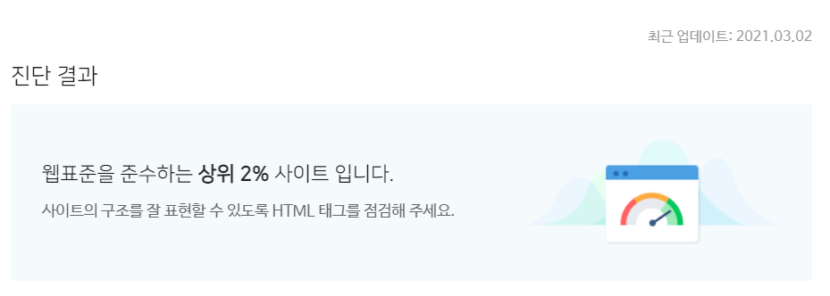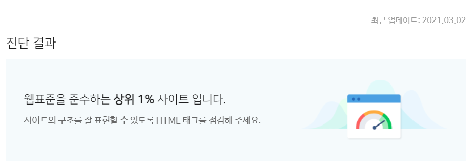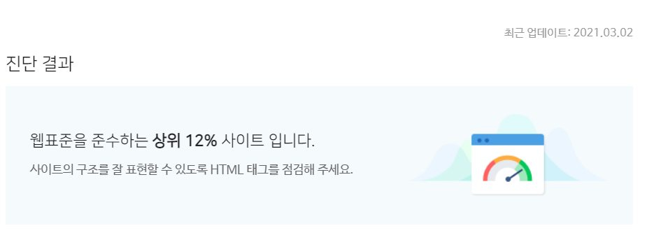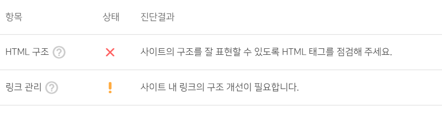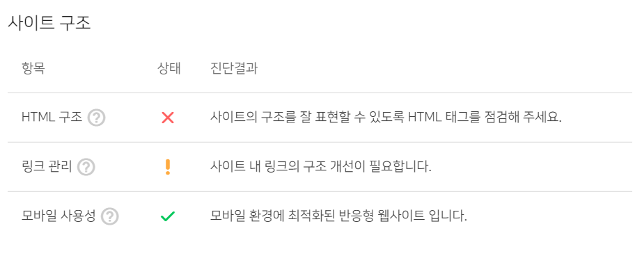 아무튼 오래간만에 들어가니 아래 사진과 같이 HTML구조에 X표시가 되어 있네요. 사이트 구조를 잘 표현할수 있도록 HTML 태그를 점검해주세요. 참 어처구니가 없지만 또 주변에 물어봤습니다.