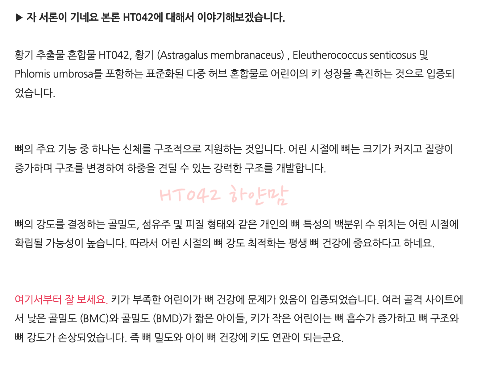 위에 제가 적어놓은 HT042에 대한 내용은 여러 외국 사이트를 돌아보고 개인적으로 핵심이라고 생각하는 내용을 가져 온것입니다. 아이들이 키가 작은것은 부족한 뼈건강에 문제가 있다고 외국에서는 이야기 합니다.