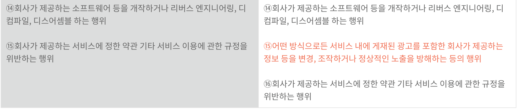 어떠한 방식으로든 서비스내에 게재된 광고를 포함한 회사가 제공하는 정보등을 변경, 조작하거나 정상적인 노출을 방해하는 행위, 이말이 이뜻이 아닐까요, 카카오가 다는 광고위치나 이런것을 제거하거나 하면 탈퇴된다 이런말 맞죠.